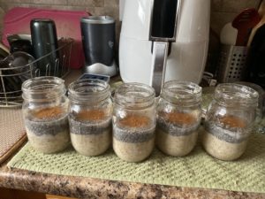 For this nutrition and protein packed breakfast, I make a batch of six small mason jars and put them in the fridge for the week, along with making my own oat milk using rolled oats to reconstitute it every morning. I made a whole video to show you how I make them if you want to watch it here.