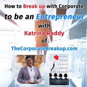 In this episode I speak with Katrina Roddy of TheCorporateBreakup.com on how she used her skills in the corporate world to take control of her career and become an entrepreneur. She talks about how she helps others use their skills, talents, and entrepreneurial spirit but don’t know how to apply them to create their own career. Give a listen if you are stuck at a job you’re not happy at, to see how you can break up with corporate!